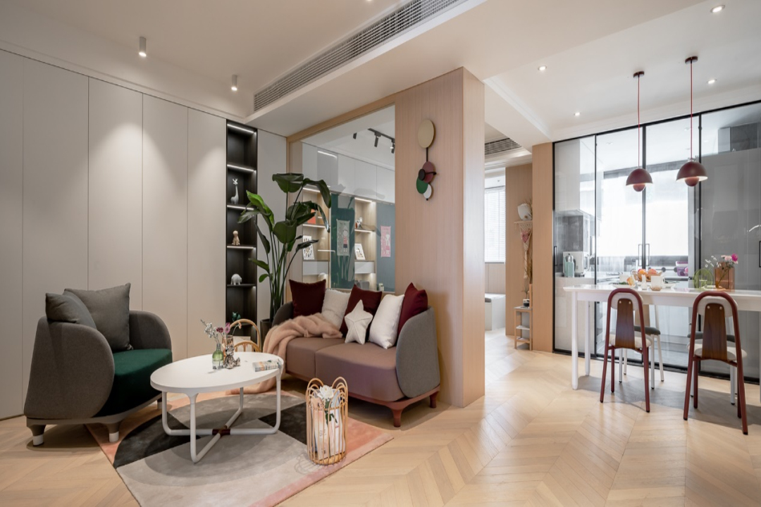 首先原始格局上由于客衛(wèi)太小,洗衣機(jī)又不適合放主衛(wèi)和廚房,因此就通過調(diào)整