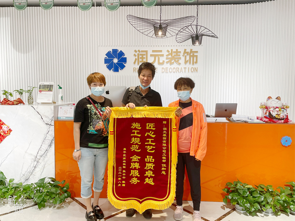 2021年8月29日上午,潤元裝飾業(yè)主,昌平區(qū)南農(nóng)家園張女士將一面繡有“匠心工藝 品質(zhì)卓越 施工規(guī)范 金牌服務(wù)”的錦旗送到了工長伍和忠的手上,以表達(dá)對(duì)潤元施工的肯定,以及對(duì)工作人員的感謝,我們會(huì)再接再厲,服務(wù)號(hào)每一位客戶。