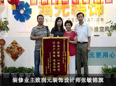 衷心感謝業(yè)主對(duì)我們公司的認(rèn)可,對(duì)公司優(yōu)秀設(shè)計(jì)師張菲的認(rèn)可,您送的錦旗是對(duì)公司以及設(shè)計(jì)師最大的肯定和鼓勵(lì)!我們會(huì)繼續(xù)努力,讓每一位業(yè)主都能享受到潤(rùn)元的貼