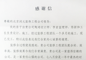 感謝信 尊敬的北京潤(rùn)元裝飾工程公司領(lǐng)導(dǎo): 我的房子由貴公司陶虹設(shè)計(jì)師、李巖監(jiān)理師、陳新和工長(zhǎng)負(fù)責(zé)設(shè)計(jì)、施工。經(jīng)過(guò)裝修工程團(tuán)隊(duì)一個(gè)多月的施工,現(xiàn)已完工,特