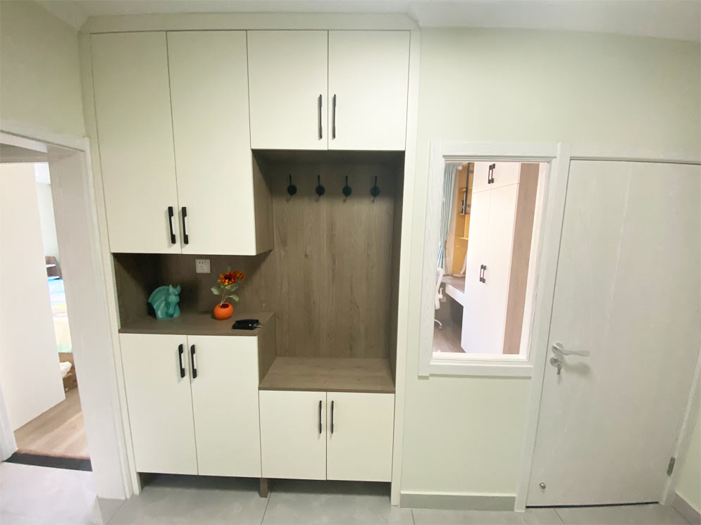 設(shè)計(jì)師將原來(lái)門廳處次臥的一面墻及門洞進(jìn)行了拆改,增加了次臥的私密性。利用定制家具設(shè)置了一組通頂門廳柜,增加了儲(chǔ)物,解決了收納難題。新增的透明玻璃隔斷,解決了入戶采光問(wèn)題。