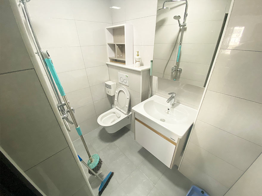 考慮到衛(wèi)生間的私密性,設(shè)計(jì)師將馬桶移到了里面,并且改為了壁掛馬桶,節(jié)省空間的同時(shí)避免了衛(wèi)生死角。洗手池放在了外面,洗手池上方的鏡箱增加了衛(wèi)生間的儲(chǔ)物。