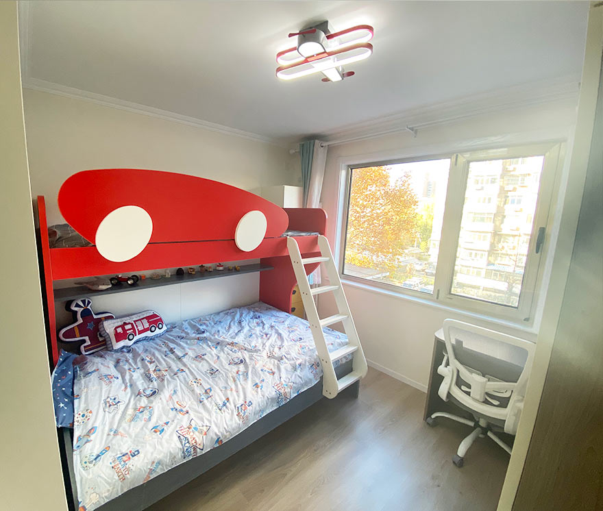 設(shè)計(jì)師將這間次臥改成了兒童房,高低床的設(shè)計(jì)方便老人照顧孩子,利用定制家具打造了一組集學(xué)習(xí),儲(chǔ)物,展示為一體的學(xué)習(xí)區(qū)域。
