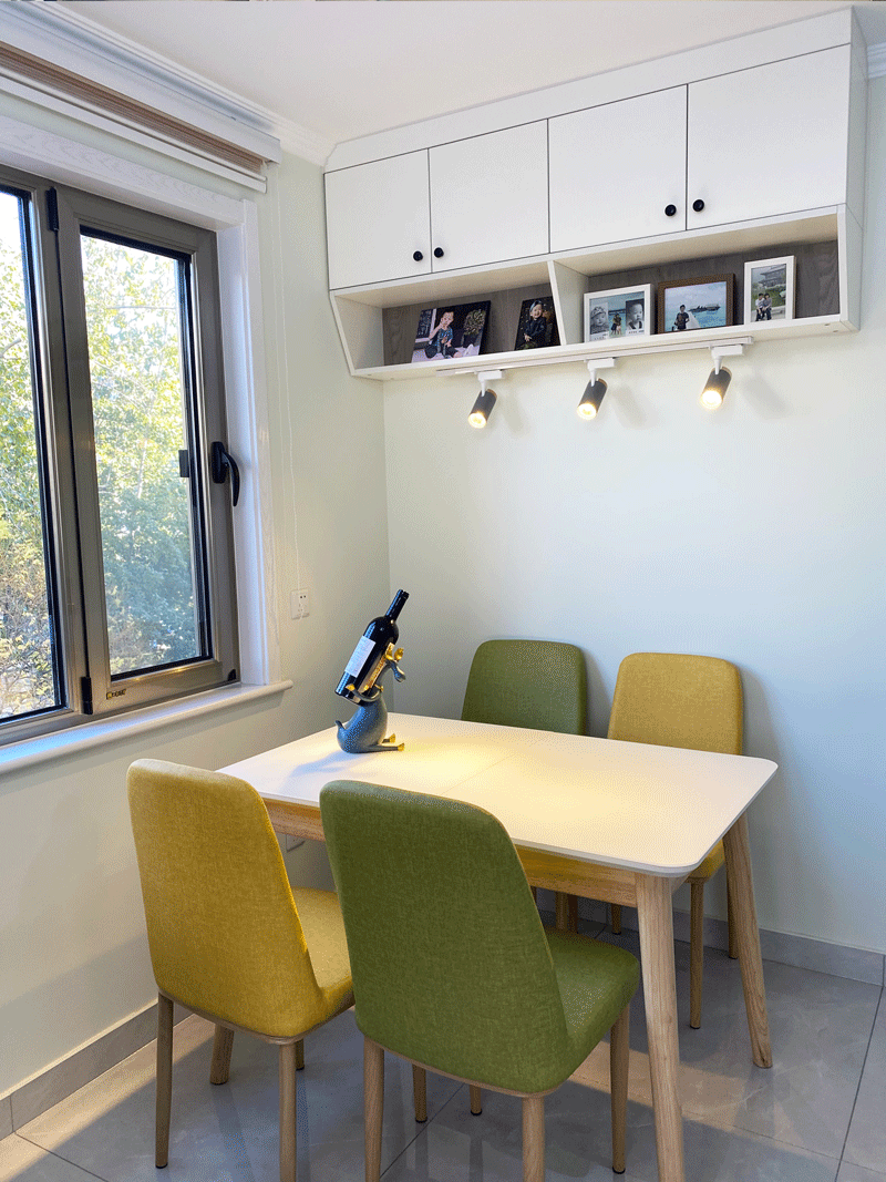 設(shè)計(jì)師將客餐廳規(guī)劃到了原來(lái)主臥位置,餐廳區(qū)域設(shè)置一個(gè)可以拉伸的600乘以1米4的餐桌,平時(shí)是四人位,拉伸后可滿足八到十人的位置需求,餐桌后面一組愛(ài)格板定制吊柜增加了儲(chǔ)物空間。
