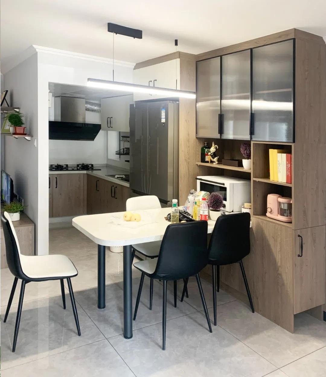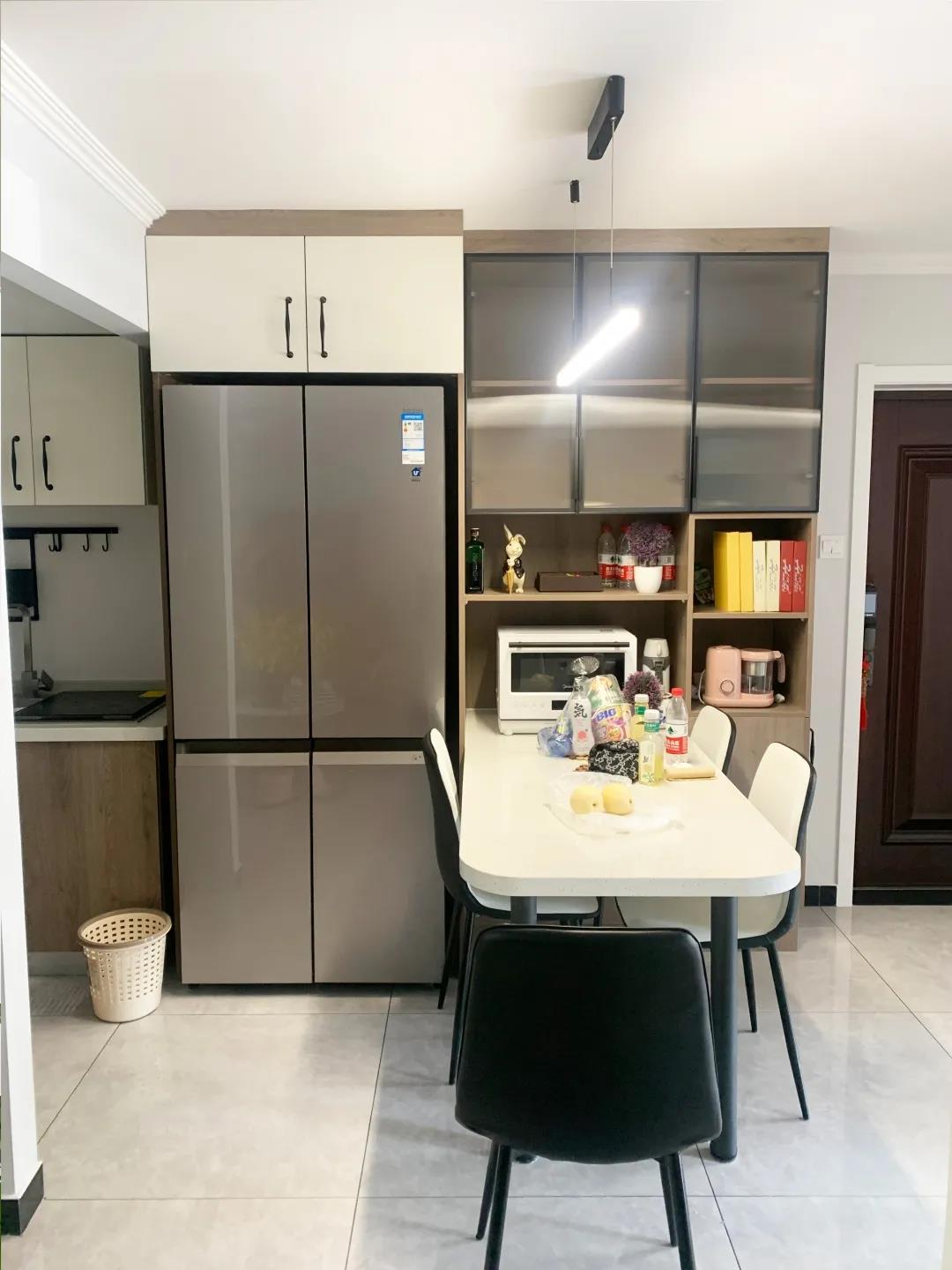 設(shè)計師拆掉了廚房與客廳間的部分墻體,同時也拆掉了廚房與門廳間的整面墻體,在此區(qū)域?yàn)楹闻恳患掖蛟炝瞬蛥^(qū),融合門廳空間,整個區(qū)域有12平米,通頂餐邊柜,滿足平時儲物需求,四開門冰箱也從廚房外移到這個位置,整個空間實(shí)用美觀。