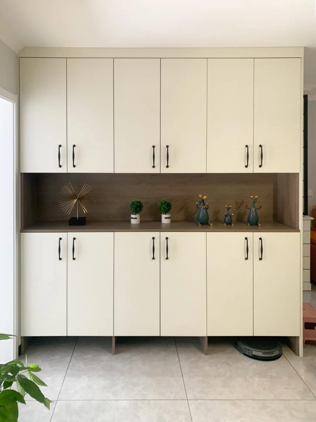 設(shè)計師封堵了正對著入戶門的衛(wèi)生間門洞,將新的門洞開在了朝向客廳的那面墻,解決了門廳門洞多的問題,同時在此區(qū)域打造了一組通頂鞋帽柜,分區(qū)儲藏,讓整個門廳實(shí)用、美觀、明亮。