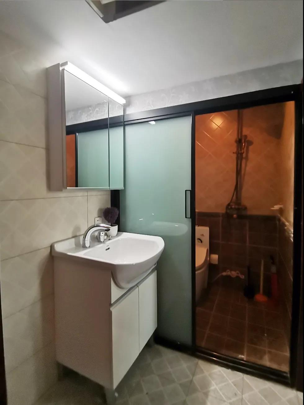 設(shè)計師張向懷將廚房地磚順延到衛(wèi)生間的干區(qū),使整體空間看起來更加寬敞明亮,浴室柜和鏡箱增加了衛(wèi)生間的儲物空間。將原來普通的鋁鎂合金門替換成了現(xiàn)在極窄邊的鋼化玻璃淋浴屏,既美觀還節(jié)省空間,同時遇高溫也不會導(dǎo)致炸裂。
