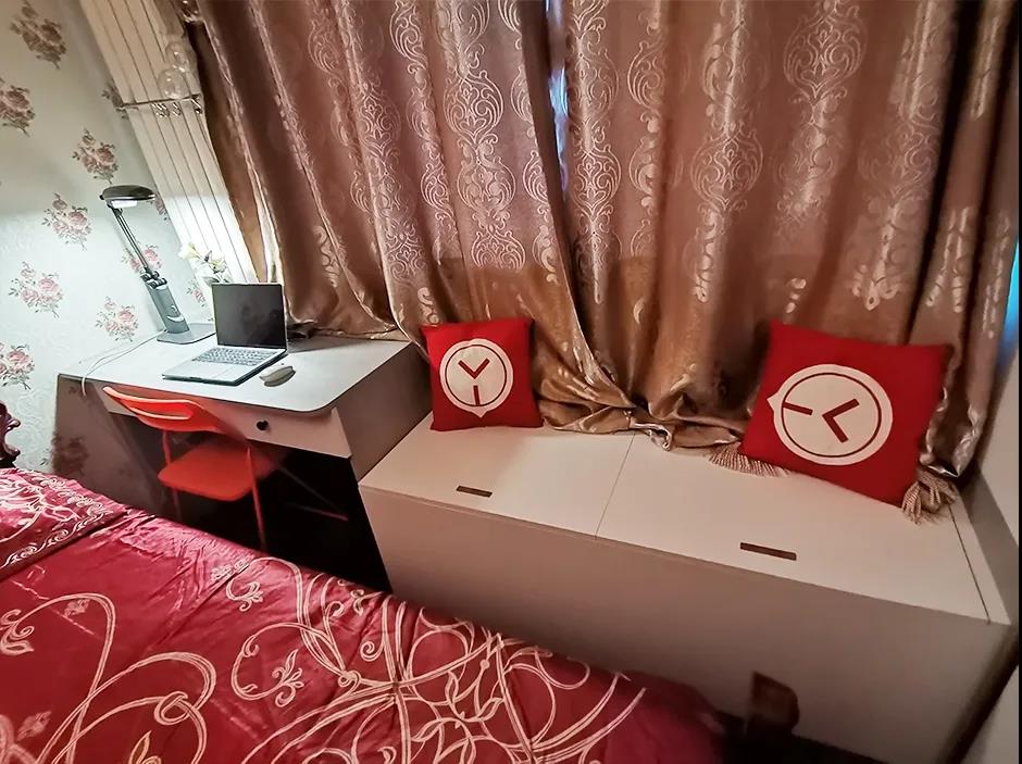 設(shè)計師將原來的衣柜移位,沿墻體設(shè)置了一組通頂大衣柜來增加主臥的儲物空間。沿窗戶區(qū)域設(shè)置電腦桌和地臺,這里既可以當做學(xué)習(xí)區(qū)也可以當做梳妝臺,地臺的設(shè)計不但可以當做卡座又增加了儲物空間。