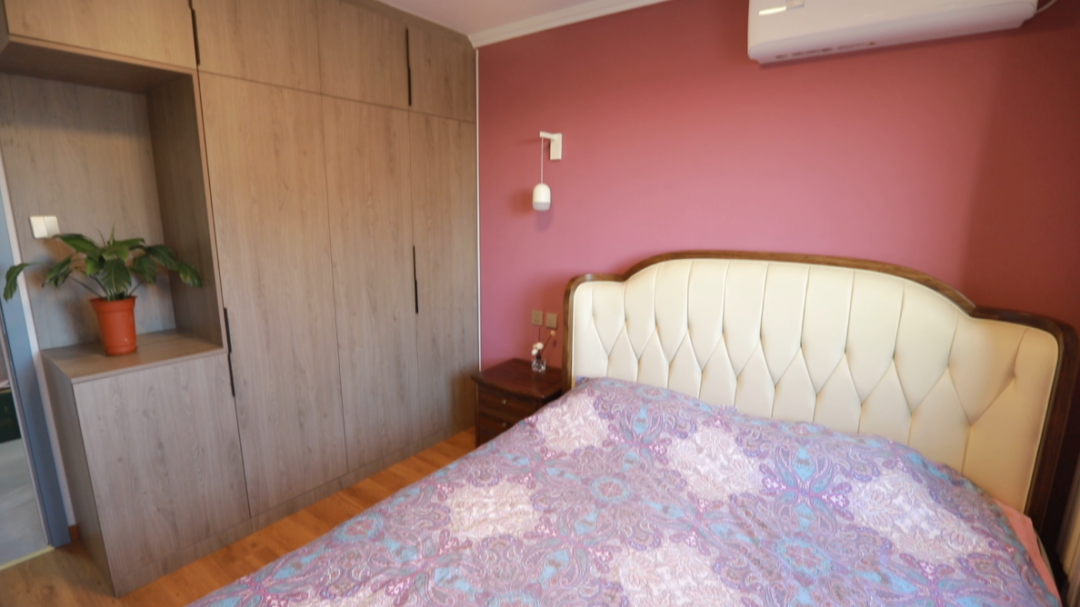 利用定制家具,在主臥實(shí)現(xiàn)了大容量?jī)?chǔ)物,為金女士打造了專屬的私密空間,暖色背景墻的設(shè)計(jì),整體空間更加開(kāi)闊、溫馨。