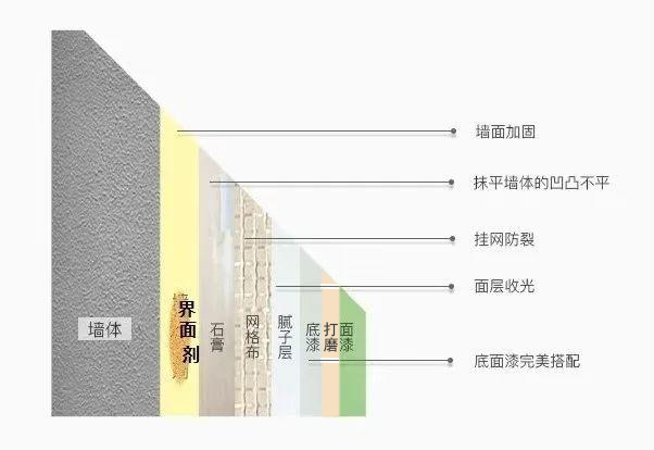 首先是鏟墻皮,然后基層水泥找平,接下來是刷界面劑,刷界面劑能夠有效的除去灰塵,讓石膏層和墻面有效的進(jìn)行粘合。再往下是石膏找平,石膏找平目前是分兩種,一種是垂平,另一種是順平。再往下是我們輕體墻貼布,貼布是有效的做一個拉伸,防止墻面開裂。
