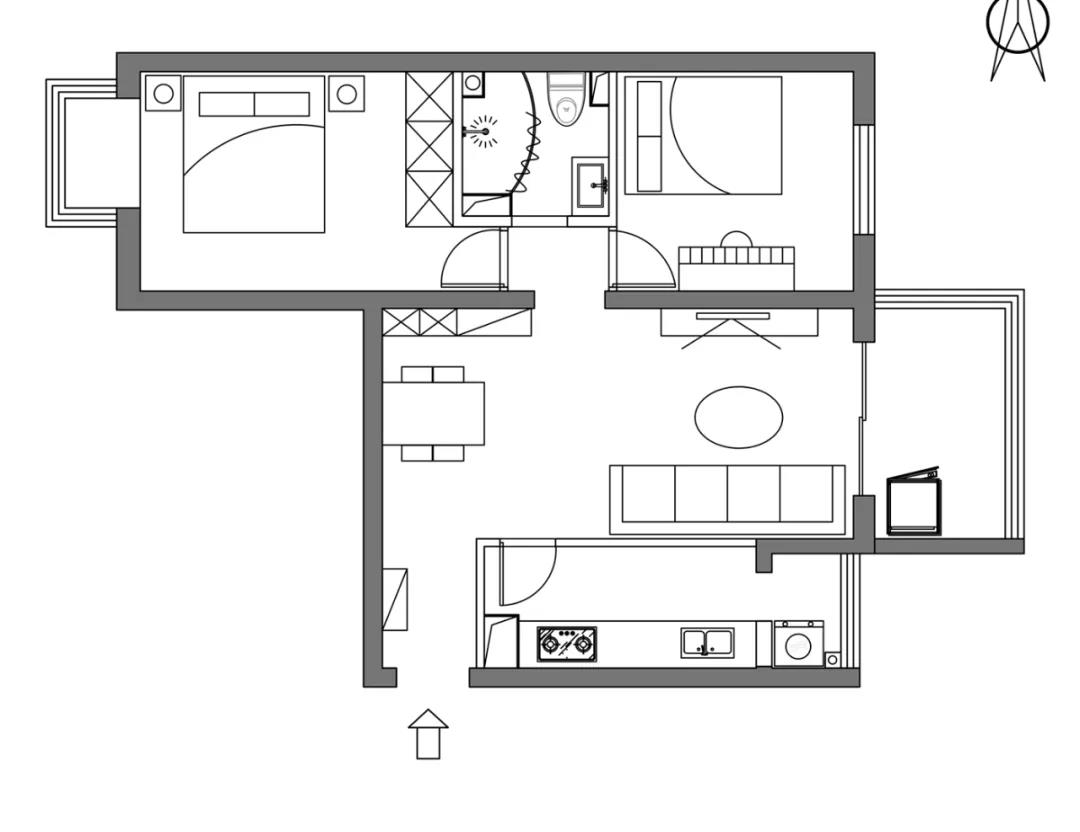 冰箱也移至廚房,廚房里拿、放、洗、切、炒,動線流暢合理。吧臺的設(shè)計,既可以儲物,也可以當(dāng)作操作臺,同時還可以當(dāng)作臨時的就餐臺,一舉多得,很是愜意。