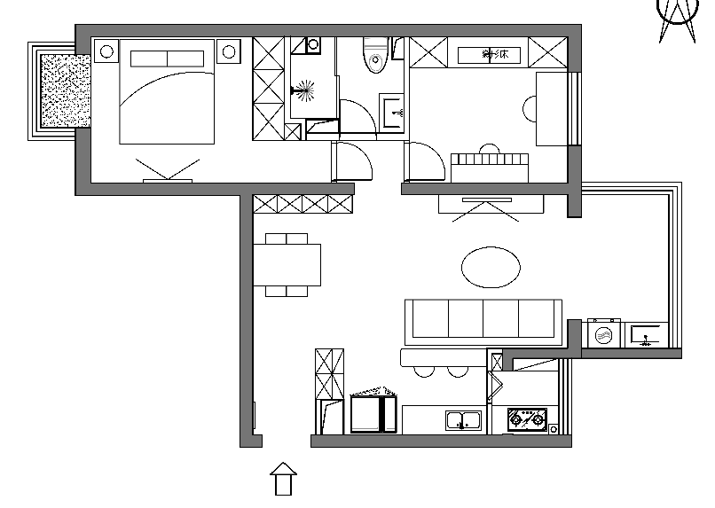 廚房有6平米,面積并不小,可因?yàn)槭莻€狹長型的格局,只能放下一組一字形櫥柜。操作空間、儲物空間都不夠。另外原來的冰箱放在客廳的陽臺上,操作動線過長,拿取東西十分不便。任先生希望改造后的廚房能夠儲物強(qiáng)大,動線合理,操作便捷。