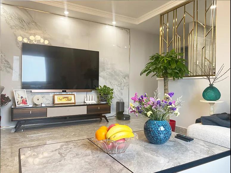 設(shè)計(jì)師將餐客廳重新規(guī)劃,21平米的餐客廳煥然一新,沙發(fā)、茶幾、電視薄柜依次擺放,原來擋在過道的餐桌重新安置,不占用過道區(qū)域,客廳最大化保留了活動空間,利用灰色系與金屬邊框相結(jié)合的手法,打造簡約的輕奢風(fēng)格。