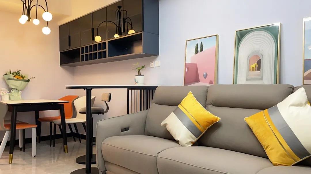 設(shè)計(jì)師將原本15平米的主臥改造成了客餐廳,沙發(fā)、電視柜依次擺放。用餐空間,設(shè)計(jì)師選擇了餐邊吊柜來幫助一家人實(shí)現(xiàn)大容量?jī)?chǔ)物,餐區(qū)與客廳中間用一組小吧臺(tái)作為區(qū)域劃分,整體空間溫馨、舒適。