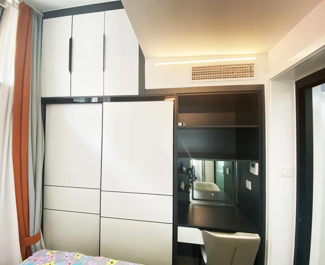 設(shè)計(jì)師將這間臥室重新調(diào)整,一整面的通頂衣帽柜滿足了臥室的儲(chǔ)物需求,而梳妝臺(tái)也是必不可少。
