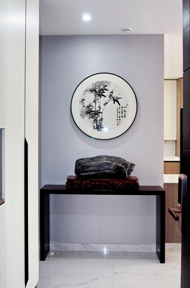 進門左手邊,設(shè)計師利用定制家具和多功能五金,為業(yè)主規(guī)劃了一組鞋帽柜,結(jié)合主人自己的畫作,在入戶門正對的這面墻,打造了屬于王先生,獨一無二的玄關(guān),為門廳增添了不少的藝術(shù)氣息。