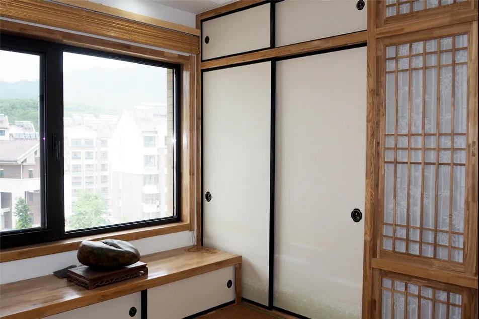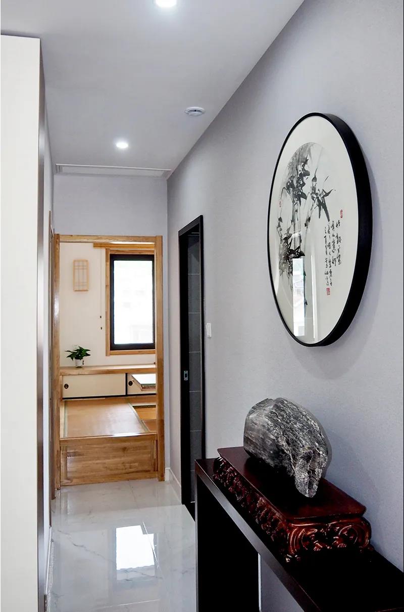 設(shè)計師將這兩間臥室合理規(guī)劃,一間作為王先生孩子的臥室,挪動次臥的門洞,沿墻體打造一組通頂衣柜,還加入了工作區(qū)域的設(shè)計。另一間則作為客房,整屋榻榻米實現(xiàn)了大容量儲物,業(yè)主王先生在這個空間還可以進行繪畫創(chuàng)作,大大提高了實用性。