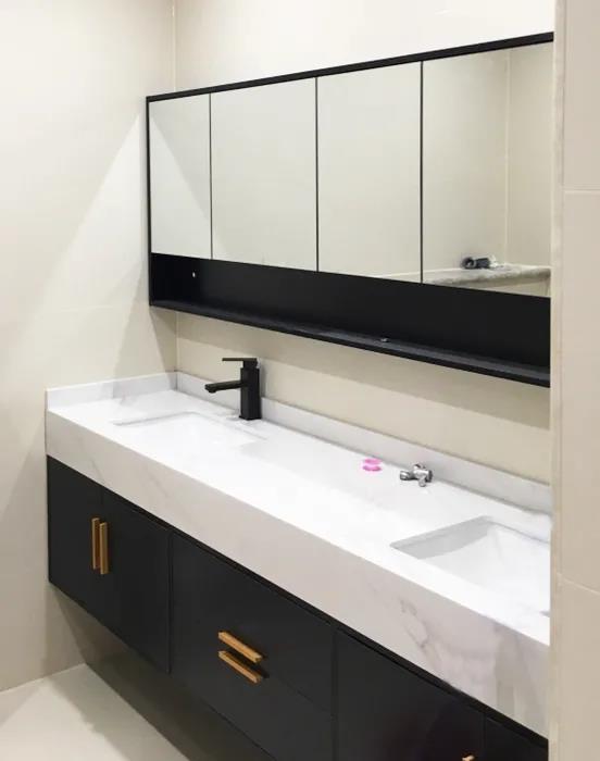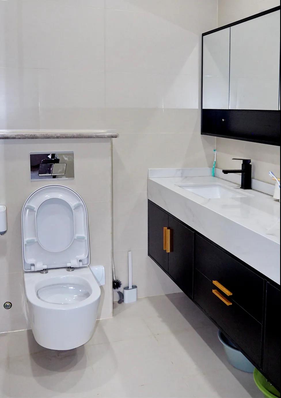 設(shè)計師結(jié)合業(yè)主的需求,打造了巖板臺面的雙盆一體的浴室柜,解決了每天上早夫妻共用洗手盆打架的問題,最大化保留了淋浴區(qū)空間,懸掛式馬桶,清理自如、無衛(wèi)生死角,整個空間采光充足、使用便捷。
