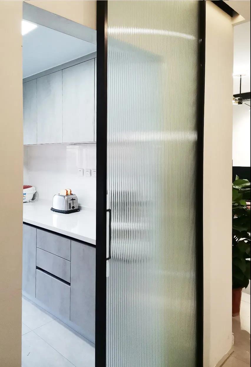 與門廳鞋帽柜相對的廚房門,設計師貼心的設計為推拉門,推拉門的使用完全不會影響到門廳和廚房空間,另外,地軌嵌入到瓷磚里,確保地面無障礙。