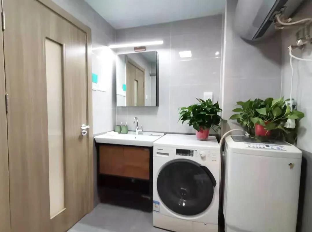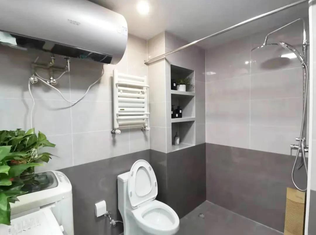 設計師將衛(wèi)生間一面墻往里推了40厘米,形成一個L形的墻體,外面是儲物柜,里面則是淋浴,進門左右邊則是洗手池和洗衣機,寬闊的淋浴空間,壁龕的設計,方便實用。