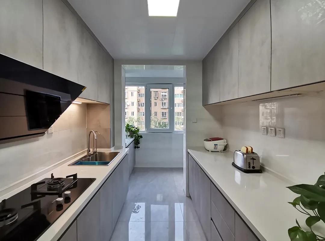 廚房空間足夠大,雙一字型櫥柜,操作方便,儲物充足,設計師貼心的根據(jù)馮女士身高,將廚房臺面高度設計為82公分高,使日常操作更舒適。隱藏式的柜體摳手,不僅美觀,也避免了磕碰,節(jié)省過道空間。