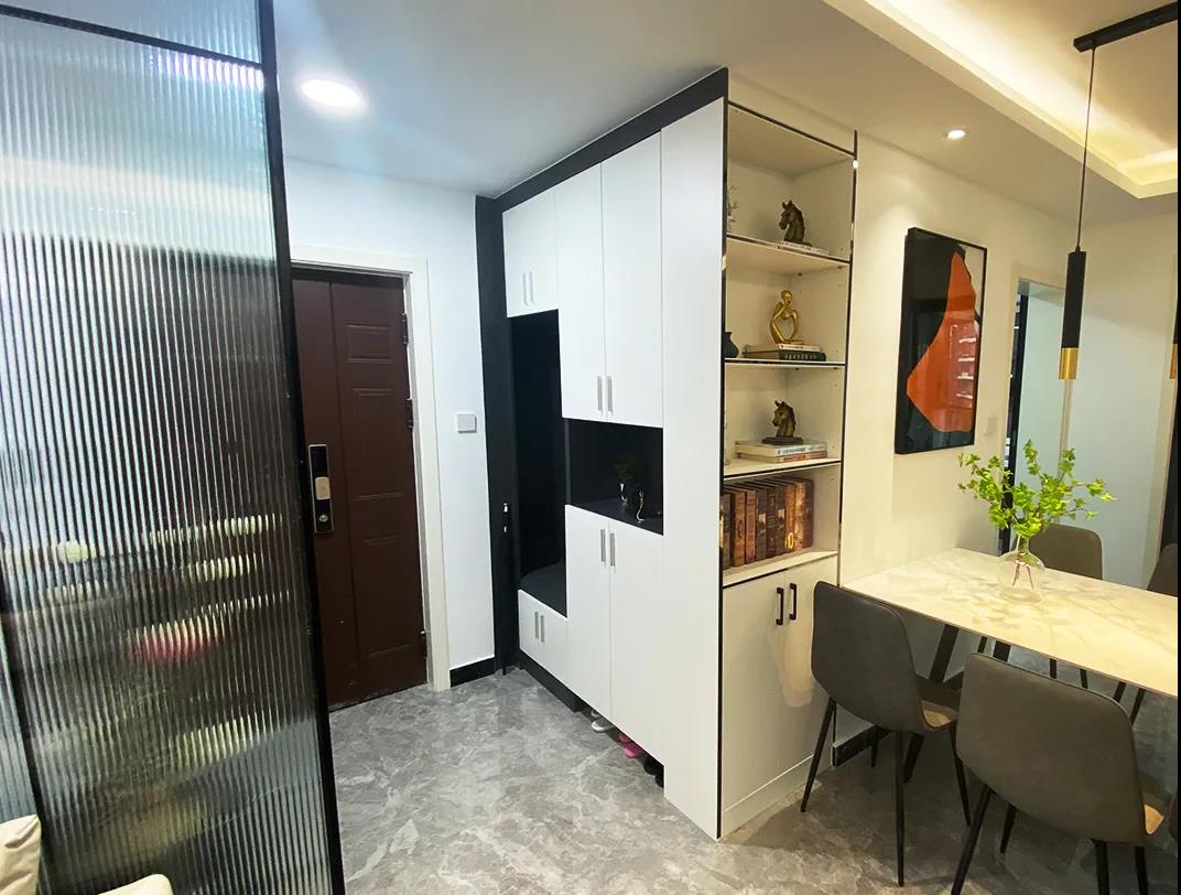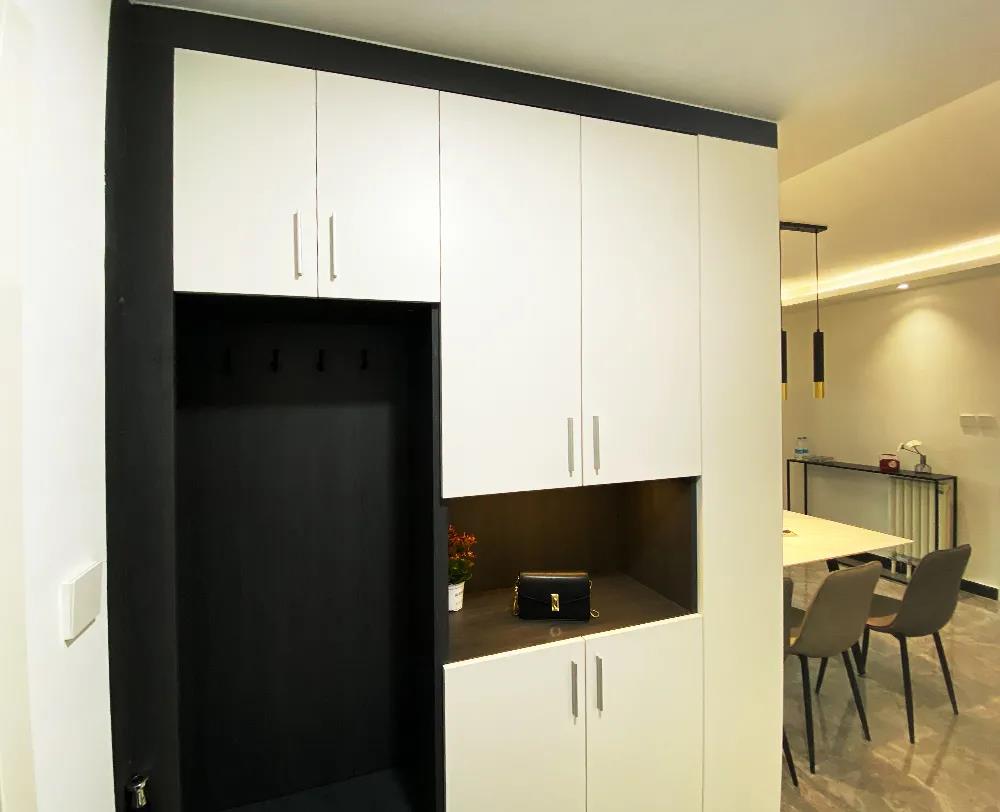 為了解決門廳采光差,缺少儲物的難題,設(shè)計師將入戶門正對的輕體墻更換成長虹玻璃,既起到了隔斷作用,保護(hù)了隱私,又解決了采光難題。同時封堵原有廚房門,在這里打造了一組通頂鞋帽柜,解決了一家人進(jìn)出的儲物收納難題。