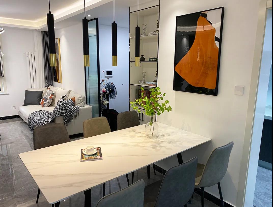 設(shè)計師將原有次臥與客廳相鄰的輕體墻向臥室方向挪動了80厘米,客廳從22平米擴(kuò)大到25平米,沙發(fā)、茶幾、電視柜依次擺放。同時,在這里規(guī)劃了用餐區(qū)域,1.8米乘以90厘米的多人位巖板餐桌,滿足趙女士親戚朋友來家聚會的需求,借助玄關(guān)柜的側(cè)面,設(shè)計師也為餐區(qū)進(jìn)行了餐邊柜的設(shè)計,改造后的餐客廳,通透、明亮。