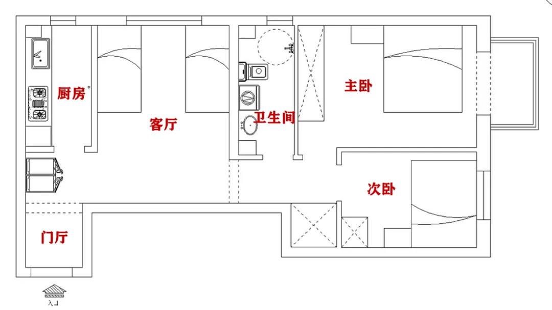 1、合理規(guī)劃門廳,增加儲物門廳將近3平米,入戶門正對著廚房,并且冰箱也放在過道上,原主人還在這里打造了一個拱形門洞,儲物、動線和采光都不是很理想。