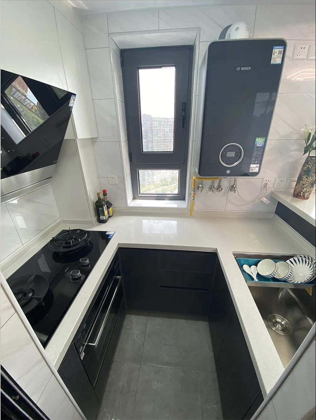 2、合理規(guī)劃廚房,增加儲物空間。廚房面積4平米,是個狹長型格局,只能擺放一組一字型櫥柜,儲物操作空間都不足,日常進出也很擁擠。