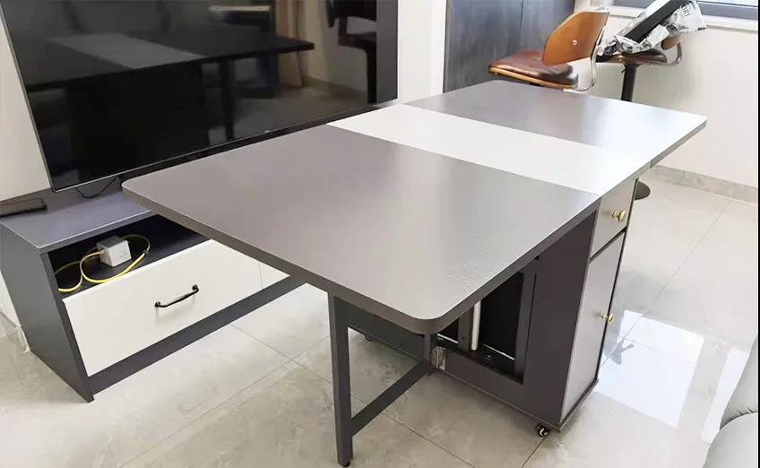 客廳新建了一面L型半高墻體,在不阻擋門廳光線的同時,又給客廳重新打造了電視墻,人多用餐的時候打開折疊餐桌就變成了一個餐廳,收起后又變成了可以會客的游戲區(qū)。
