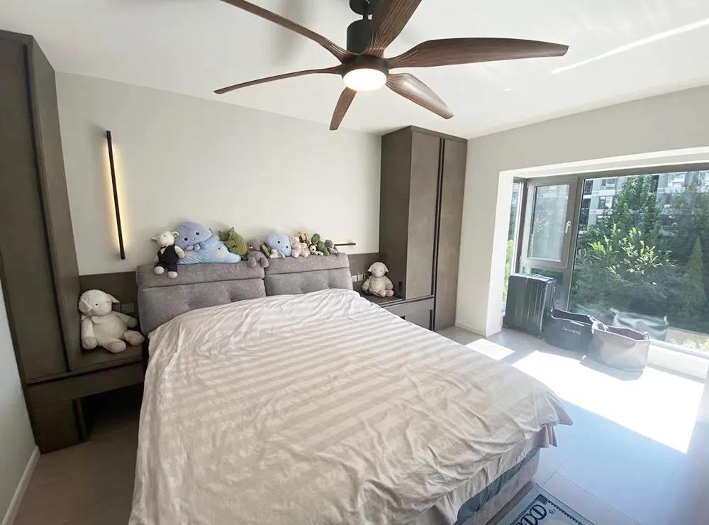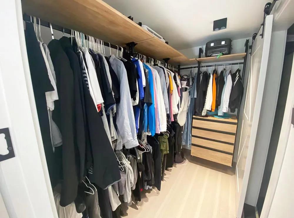 主臥室調(diào)整了門的位置后,重新進(jìn)行了規(guī)劃,原有過道處改為了步入式衣帽間,金屬與原木兩種材質(zhì)打造出掛放區(qū),拿取方便,環(huán)保無污染。