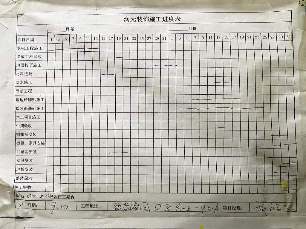 施工進度表可以很清晰的看到工程計劃,方便工長合理安排施工、業(yè)主對照施工。