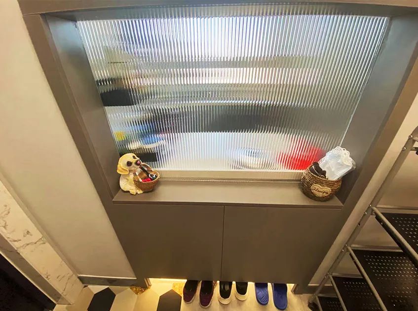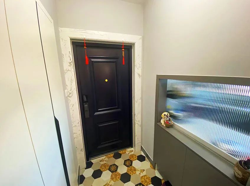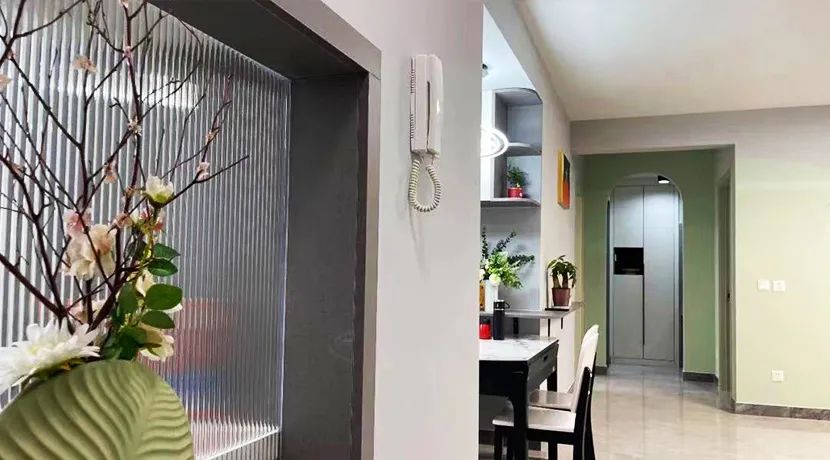門廳:設(shè)計(jì)師借用門廳與廚房相鄰的輕體墻,拆掉部分墻體打造了一組雙面柜,上方利用長虹玻璃借用廚房的光線給門廳空間增加采光,下方的柜體進(jìn)行了雙面柜的設(shè)計(jì),這里放鞋,感應(yīng)燈讓玄關(guān)區(qū)域使用更便捷。將進(jìn)門右手邊的衣帽間打造成儲(chǔ)物間,用來存放清潔用品和不常用的行李箱、梯子,大大提升了利用率。