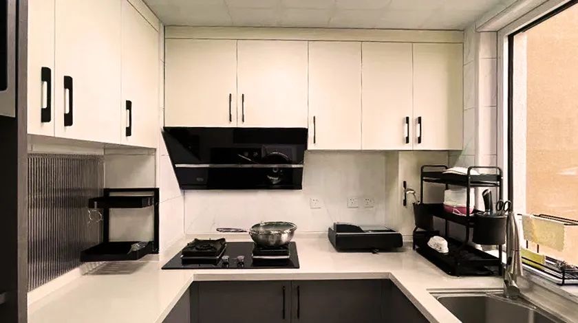 廚房:設(shè)計(jì)師借用門廳與廚房相鄰的輕體墻,拆掉部分墻體打造了一組雙面柜,上方利用長虹玻璃借用廚房的光線給門廳空間增加采光,下方的柜體進(jìn)行了雙面柜的設(shè)計(jì),這里放鞋,感應(yīng)燈讓玄關(guān)區(qū)域使用更便捷。將進(jìn)門右手邊的衣帽間打造成儲(chǔ)物間,用來存放清潔用品和不常用的行李箱、梯子,大大提升了利用率。