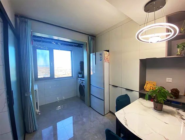餐區(qū):餐區(qū)面積5平米,設(shè)計(jì)師利用定制家具在這里為徐女士一家打造帶拐角的通頂餐邊柜,不僅增加了餐廳儲(chǔ)物,將無法納入廚房的冰箱也放置在了這里,拿取方便。四人位餐桌解決了一家人用餐的問題。而這個(gè)2.4平米的陽臺(tái)空間被改造成洗衣房,定制儲(chǔ)物柜、電動(dòng)晾衣架讓洗衣晾衣更加方便。