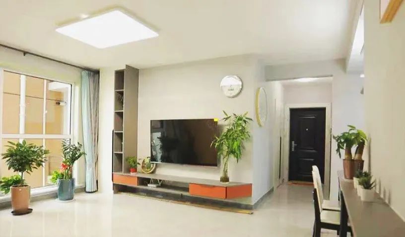 客廳:利用潤元的定制家具,為徐女士一家打造了L型電視柜,沙發(fā)、茶幾依次擺放,拼色沙發(fā)背景墻的設(shè)計(jì)讓客廳整體更富有層次。