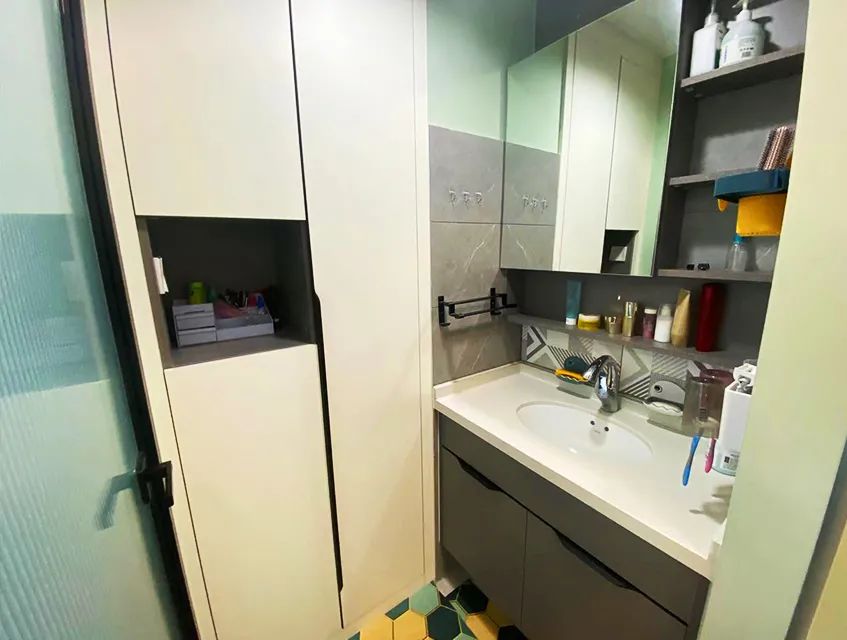 衛(wèi)生間:為了避免入戶門正對(duì)衛(wèi)生間馬桶區(qū)域的尷尬,設(shè)計(jì)師把衛(wèi)生間和臥室共用的輕體墻改為S形墻,將洗手池設(shè)置在了這里,規(guī)劃為衛(wèi)生間的干區(qū)。新建墻體,里面為衛(wèi)生間濕區(qū),對(duì)調(diào)馬桶和淋浴區(qū)位置,使用更方便。