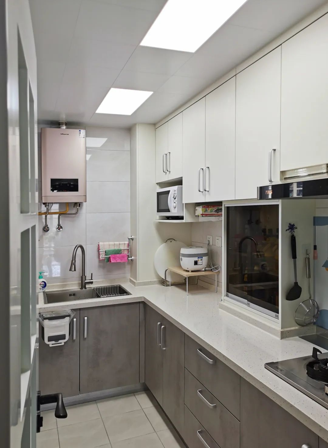次臥門(mén)移動(dòng)后,廚房的門(mén)也隨之改變,與煙道齊平,結(jié)合潤(rùn)元的《廚房設(shè)計(jì)調(diào)研單》重新規(guī)劃了廚房,一字形櫥柜調(diào)整為L(zhǎng)形,重新布局了洗切炒動(dòng)線,歸納細(xì)分了儲(chǔ)物,同時(shí)將可利用的空間都充分利用上,讓整個(gè)廚房空間更好用。