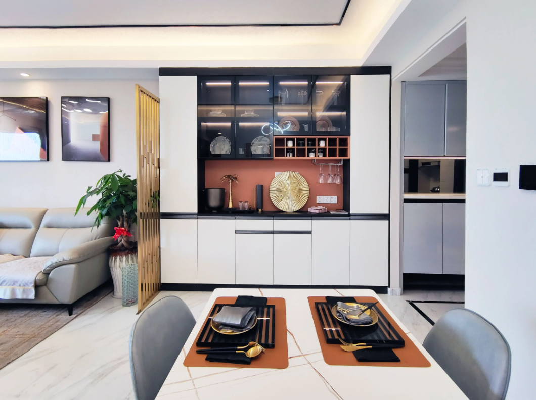 除此之外,定制家具也是客廳儲物增容的能手。不僅能有效利用空間,增加儲物收納,還能輕松解決異形空間帶來的不便,同時還能劃分區(qū)域,保持整體性,提高空間感。
