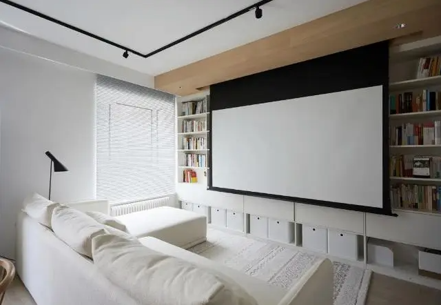 對于喜愛看電視的家庭來說,電視背景墻可以打造一組展示柜,電視內(nèi)嵌其中,既滿足了客廳儲物和展示的功能,觀影也不受限制。如果家庭中使用的是投影,也可以兩邊做展示柜,中間留白做投影區(qū)域,或者打造整組柜子,柜子前端設計隱形幕布,需要的時候就放下來,不看的時候就可以升上去。