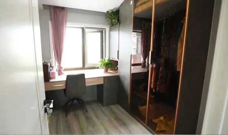 為了讓空間使用更方便,設(shè)計(jì)師將主臥里的衣帽間改為公共衣帽間,方便一家三口使用。10平米的空間里,掛衣、放包,儲(chǔ)存應(yīng)季衣物或被褥。在臨窗的位置還為業(yè)主打造了梳妝臺(tái),讓生活充滿儀式感。