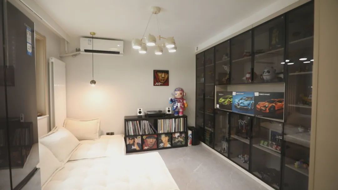 設(shè)計(jì)師結(jié)合謝先生夫妻倆的需求,客廳里放棄了傳統(tǒng)的沙發(fā)、電視、茶幾三件套,而是利用潤(rùn)元的定制家具,打造了集休閑、展示、儲(chǔ)物為一體的放松空間。