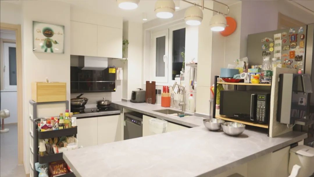 設(shè)計(jì)師拆除了廚房的部分墻體,做成開放式廚房,結(jié)合業(yè)主身高打造的不同高度的一組L型櫥柜,也方便后期使用,島臺(tái)的設(shè)計(jì),更是便于一家人的互動(dòng)溝通。廚房上的梁也被設(shè)計(jì)師巧妙隱藏進(jìn)吊頂里,整個(gè)頂面更為整體美觀。