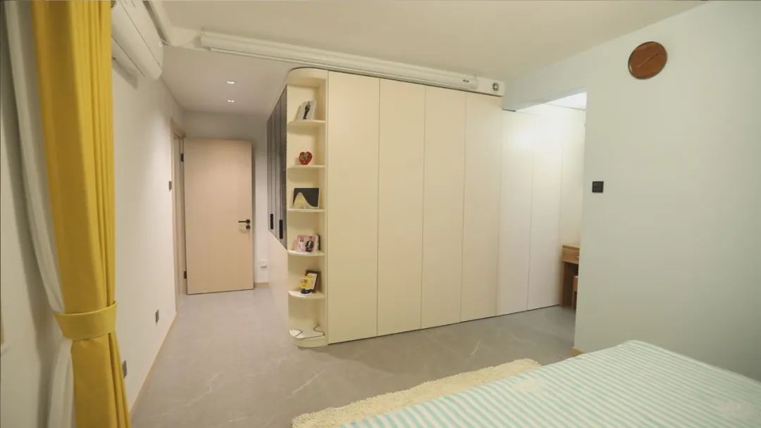 設(shè)計(jì)師把另外一套房的客餐廳空間,規(guī)劃成了謝先生夫妻的主臥,加上內(nèi)嵌一個(gè)衛(wèi)生間,形成一個(gè)套間,整體空間舒適,原本入戶門的位置,放置了梳妝臺(tái),靠近衛(wèi)生間洗漱化妝非常方便,同時(shí),在原本餐廳的位置,利用潤(rùn)元的定制家具做了一個(gè)隱形步入式衣帽間。