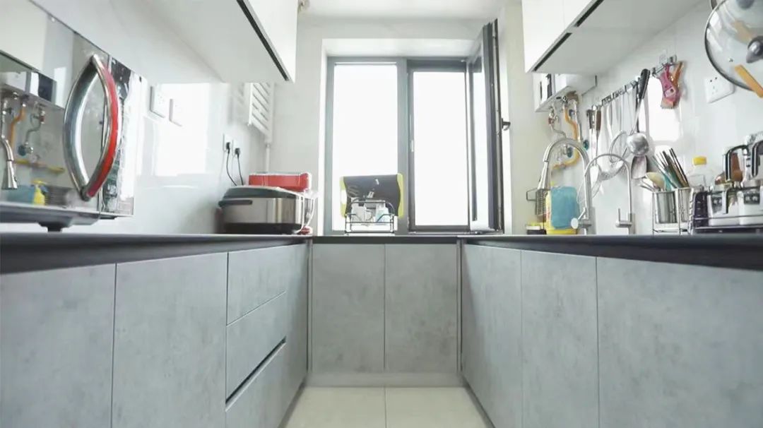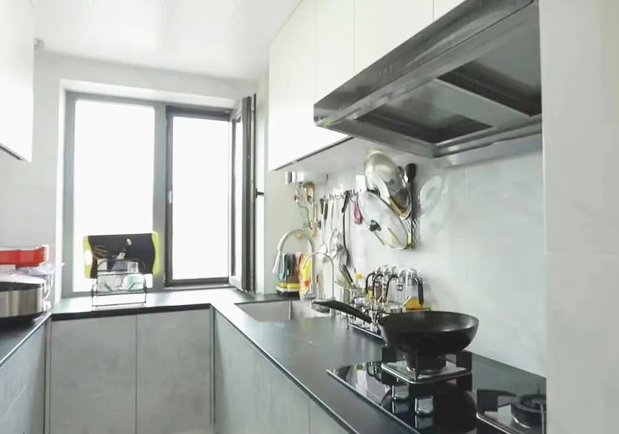 設(shè)計師把冰箱移出廚房,將原有雙一字形櫥柜更換為U形櫥柜,增加了操作及儲物空間,調(diào)整了使用動線后,廚房使用方便,功能齊全。