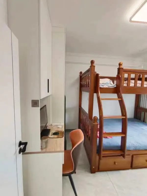 設(shè)計師拆除了次臥陽臺的推拉門,將陽臺的采光引入臥室,讓整個空間更加明亮溫馨,利用潤元的定制家具,打造了一組集儲物、上網(wǎng)休閑的多功能定制柜,以及一組斗柜,增加了次臥的收納空間。
