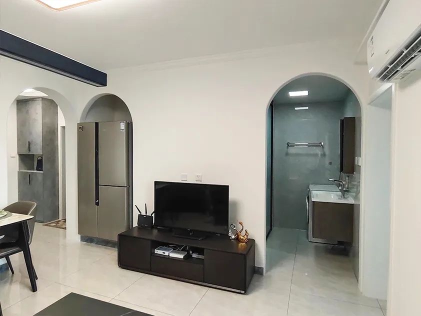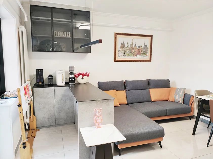 設(shè)計師將客廳與衛(wèi)生間共用的一面墻體重建為了一面Z字型墻體,利用墻體的凹陷空間放置了雙開門冰箱,將四人位沙發(fā)改為三人位后,利用空余的空間為業(yè)主打造了吧臺,吧臺下面的地柜以及吊柜為客廳增加了收納空間。