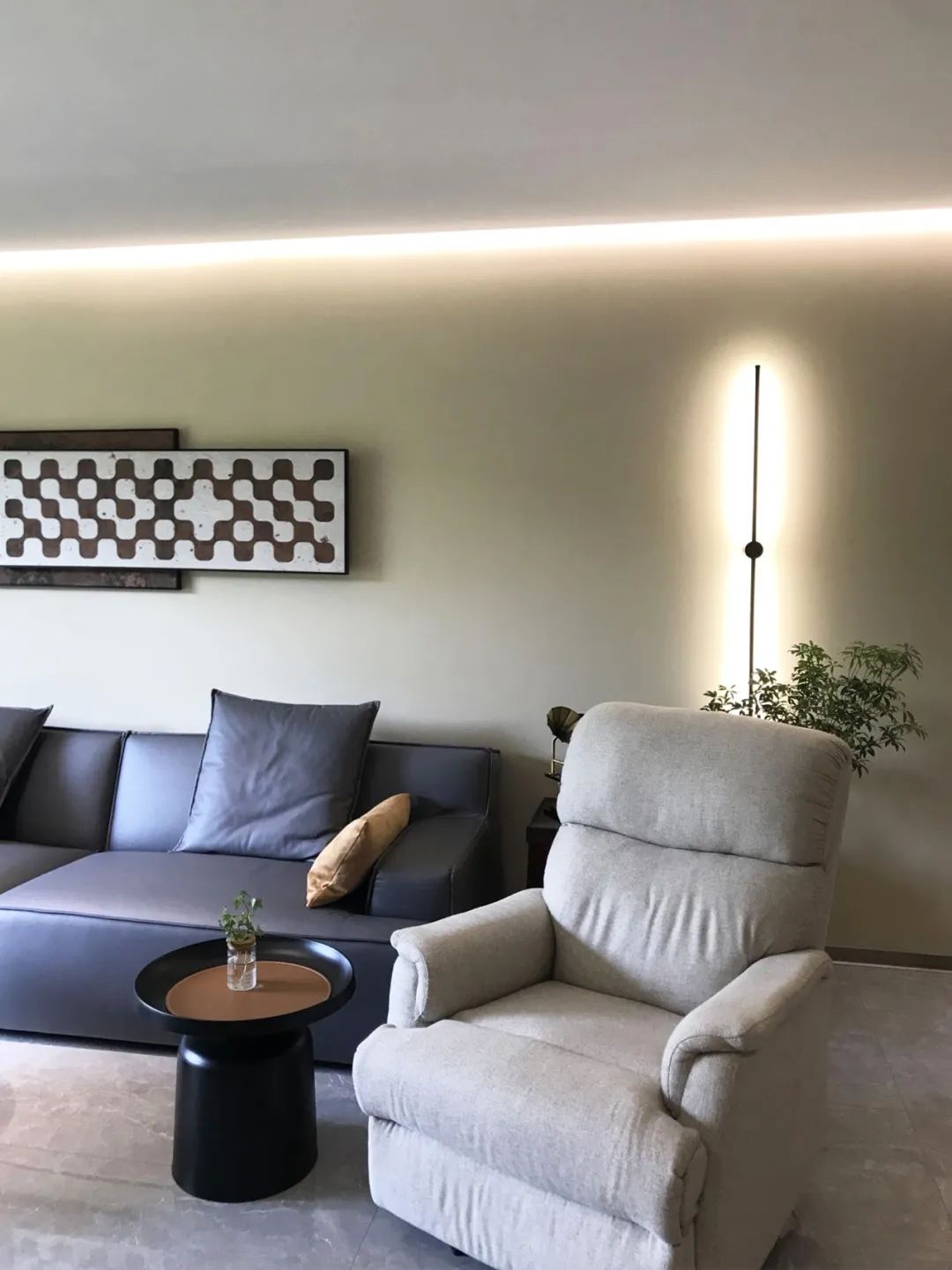 客廳一分為二,一部分擔(dān)當(dāng)會客功能,會客空間整體呈環(huán)抱式,聊天、觀影更為舒適,另一部分為餐區(qū),兼具茶歇和繪畫休閑等功能,整體空間無主燈設(shè)計,點線光源搭配軟裝,時尚前衛(wèi)。