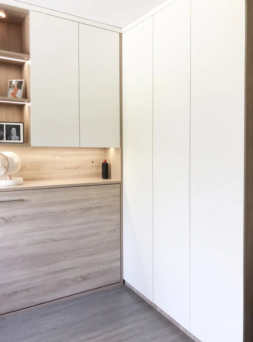 潤元定制家具打造多功能房,3米長的懸空寫字臺,儲物柜及隱藏式壁床,讓這個房間兼具娛樂、讀書學(xué)習(xí)和休息的功能。
