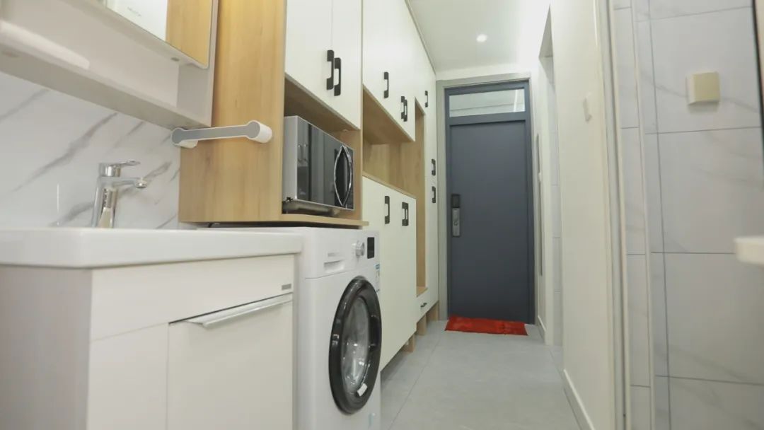 門廳—— 一組功能分區(qū)明確的定制柜,一部分作為鞋帽柜,滿足門廳收納一部分作為電器柜,補(bǔ)充廚房?jī)?chǔ)物,同時(shí)將洗衣機(jī)內(nèi)嵌其中,節(jié)約衛(wèi)生間空間。
